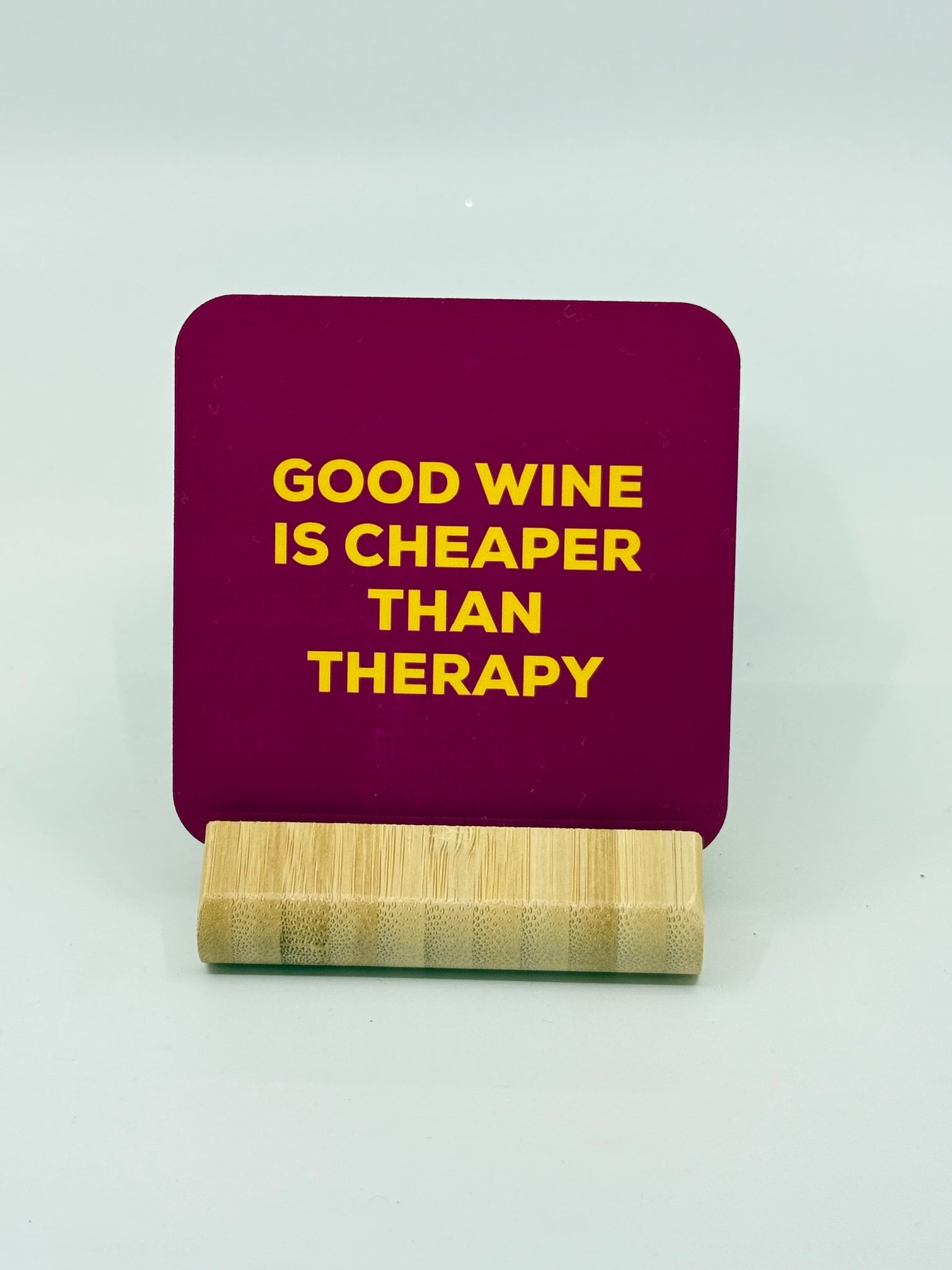This coaster features the quote: “Good wine is cheaper than therapy”.