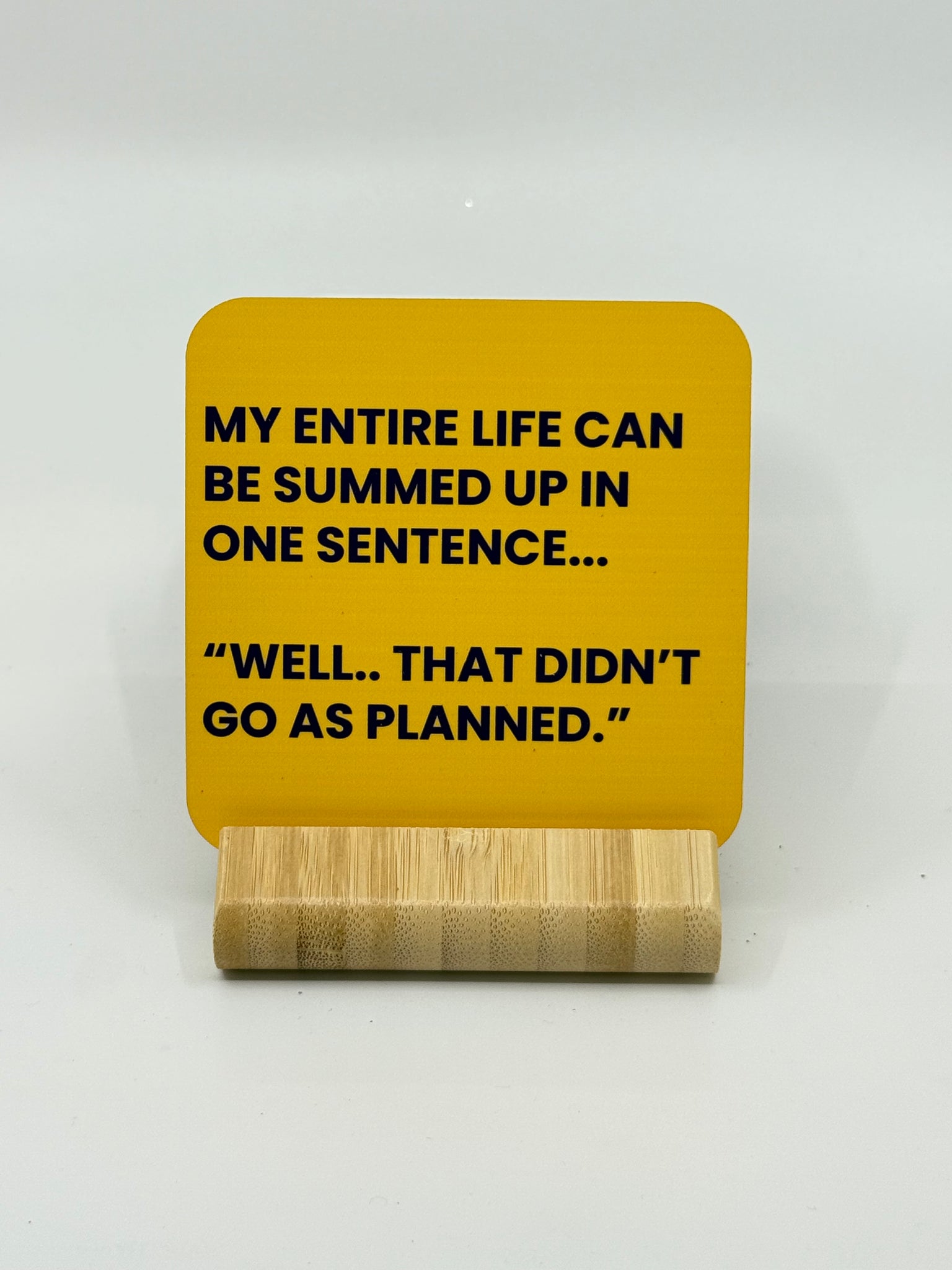 This coaster features the quote: “My entire life can be summed up in one sentence…Well…that didn’t go as planned”.