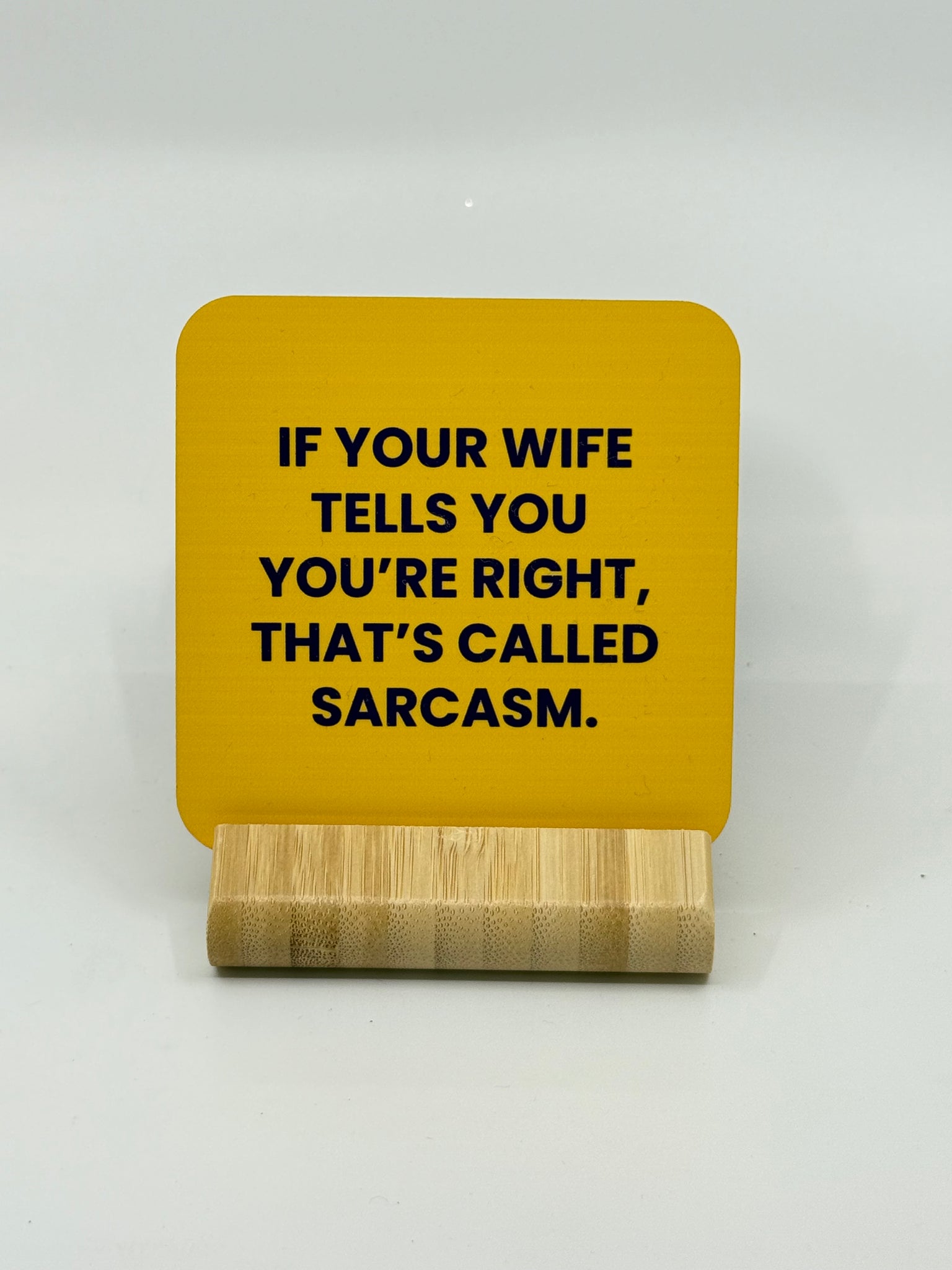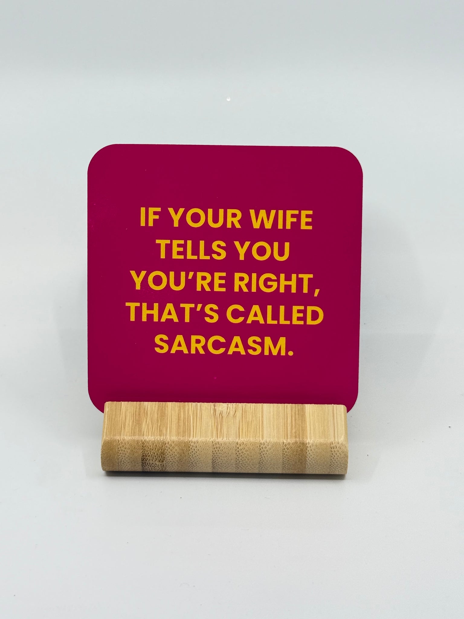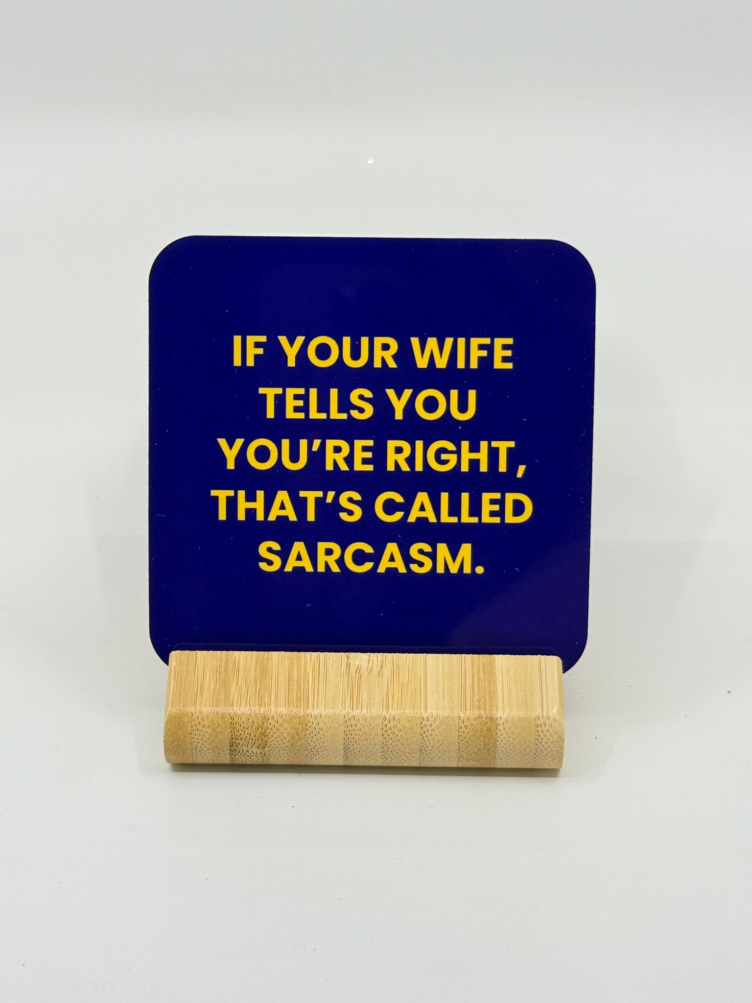 This coaster features the quote: “If your wife tells you you’re right, that’s called sarcasm”.