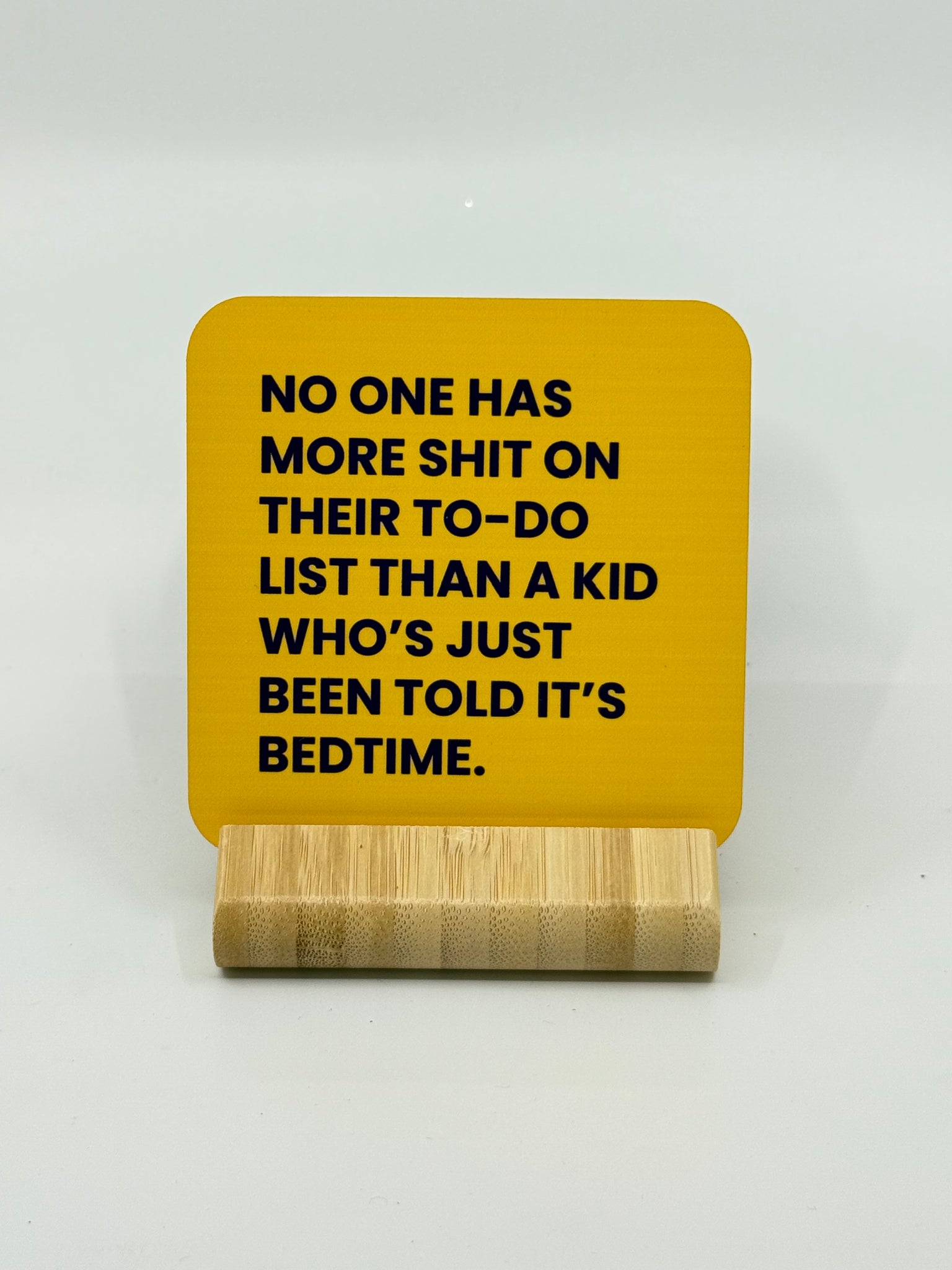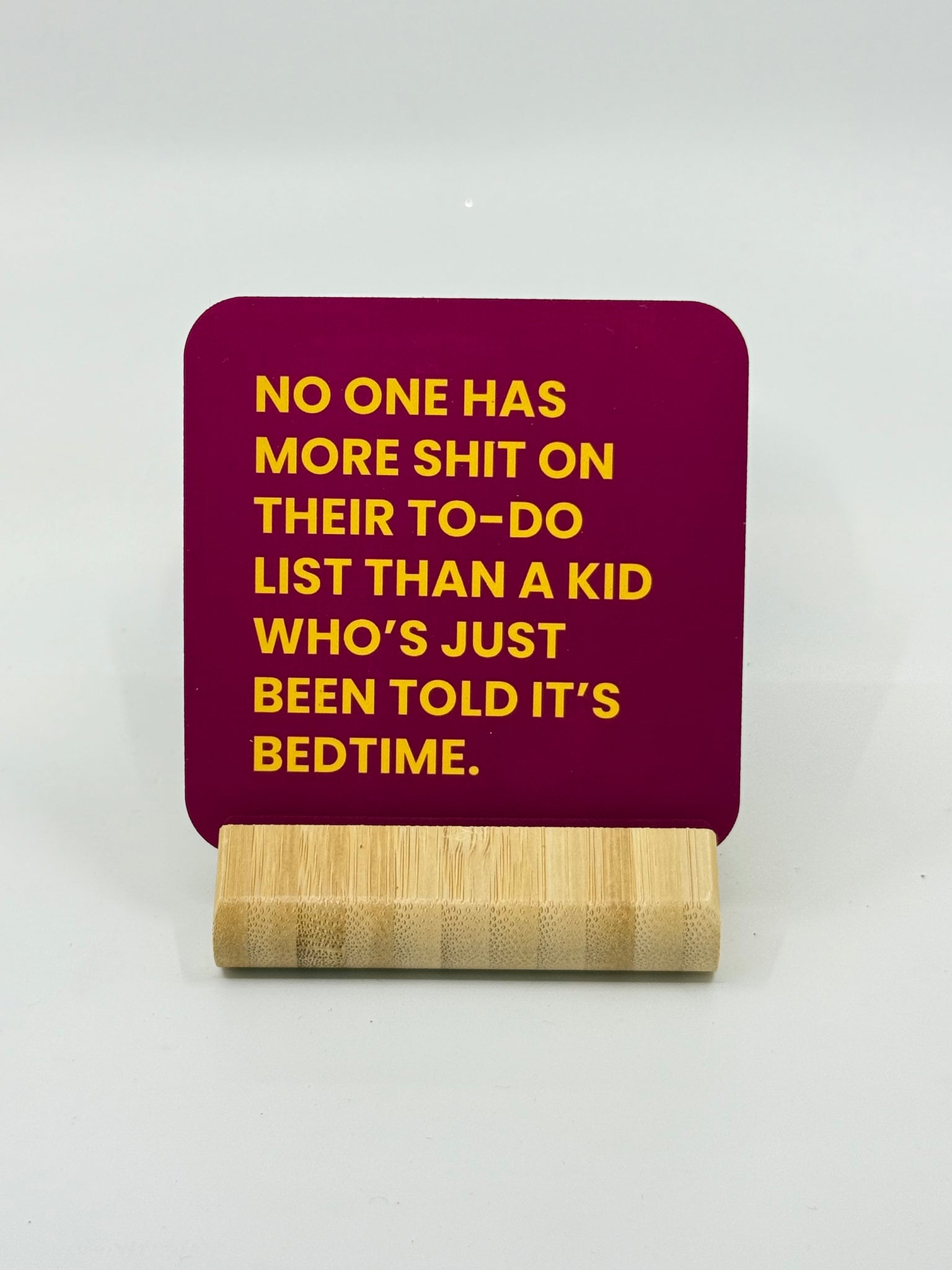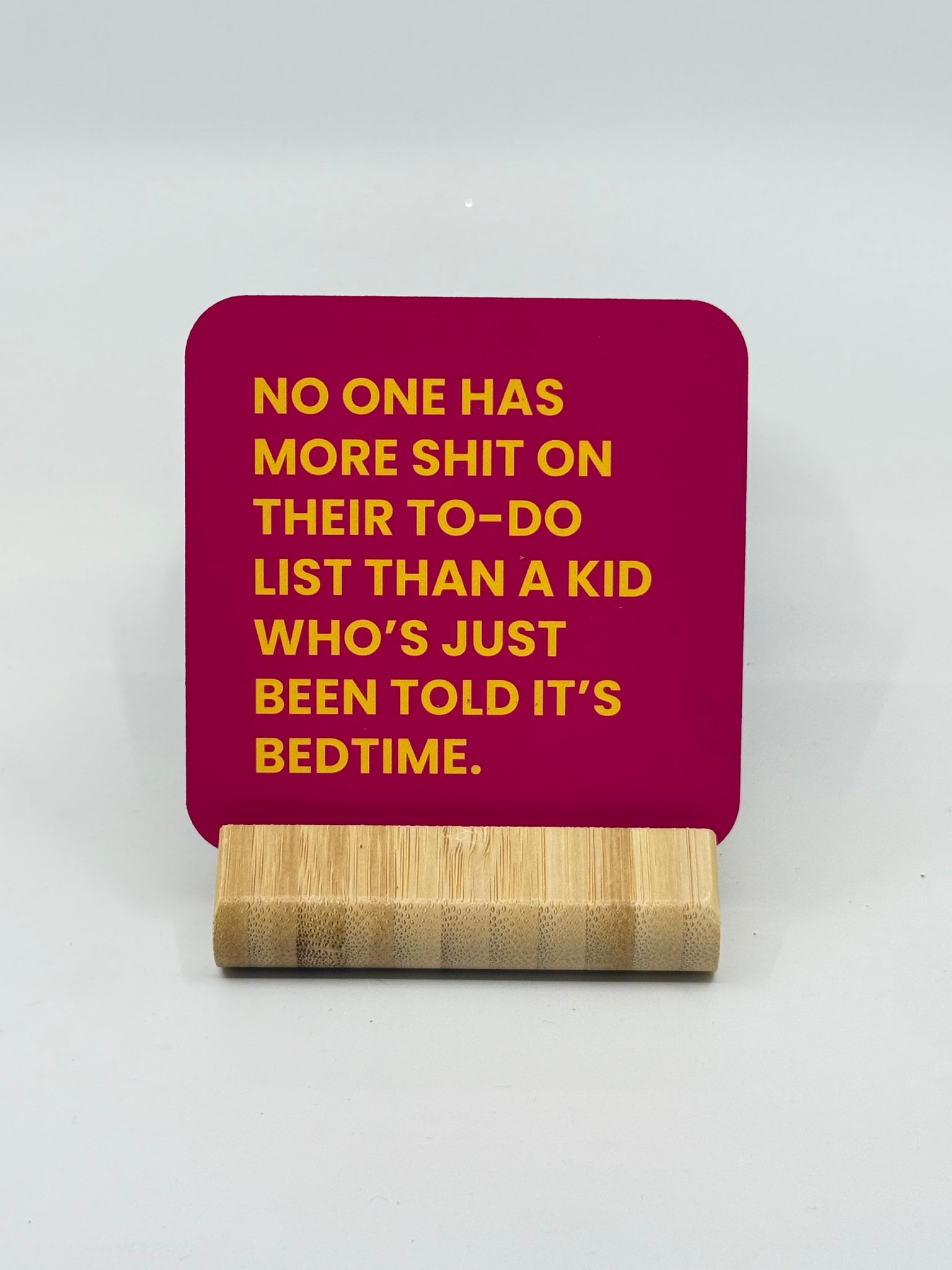 This coaster features the quote: “No one has more shit on their to-do list than a kid who’s just been told it’s bedtime”.