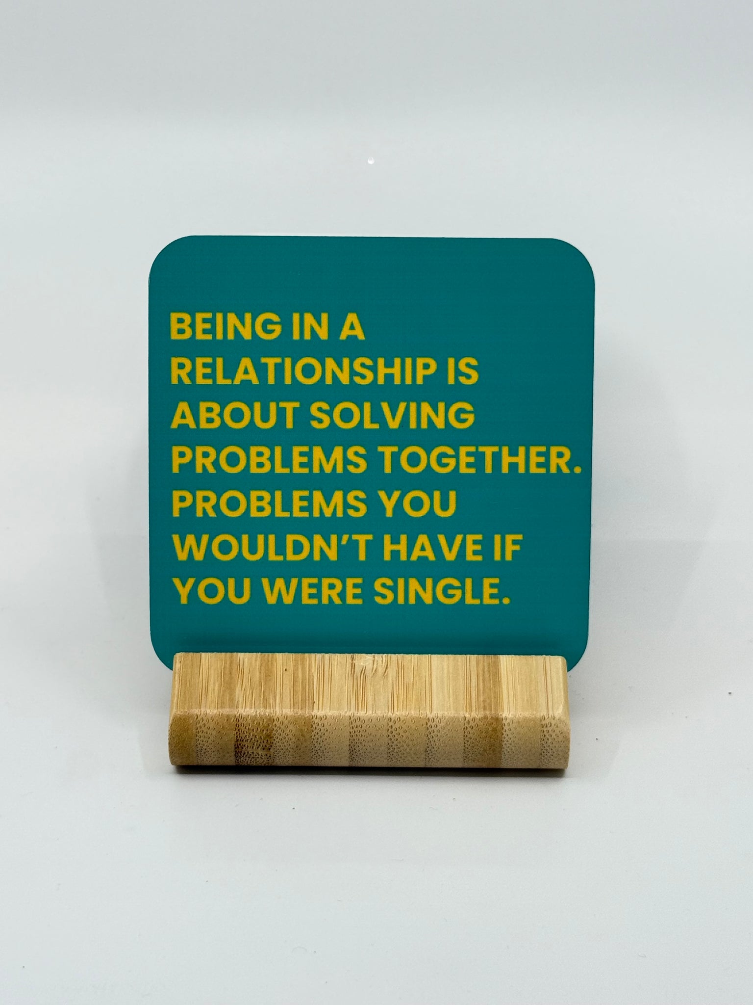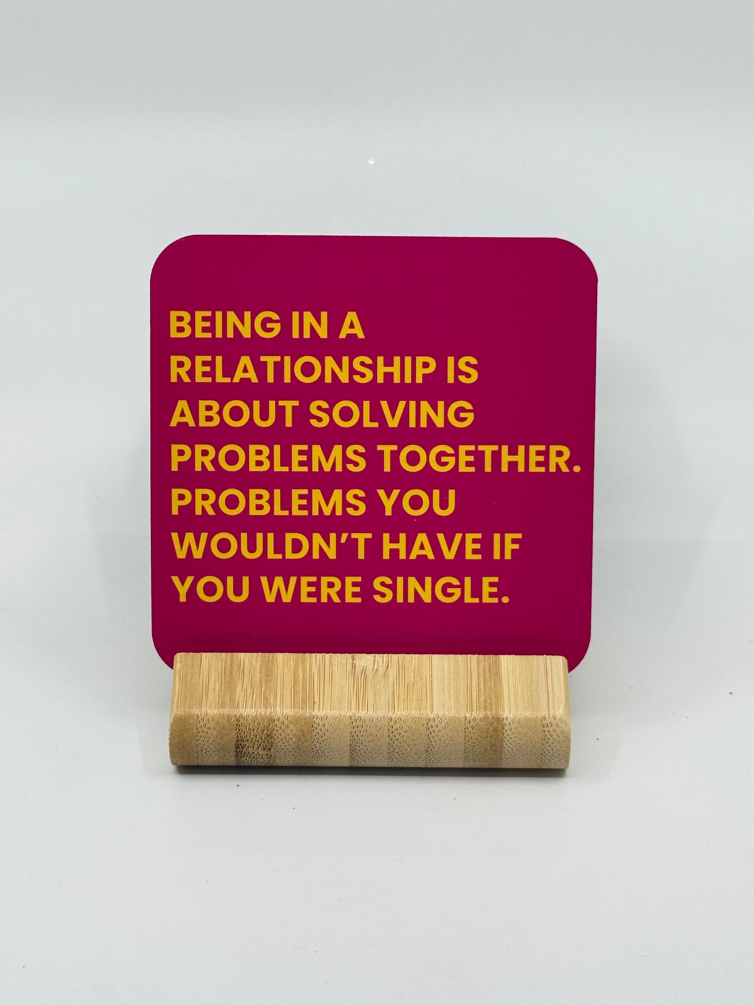 This coaster features the quote: “Being in a relationship is about solving problems together. Problems you wouldn’t have if you were single”.